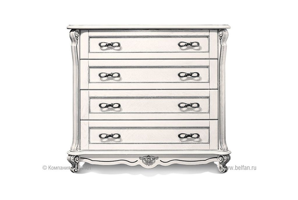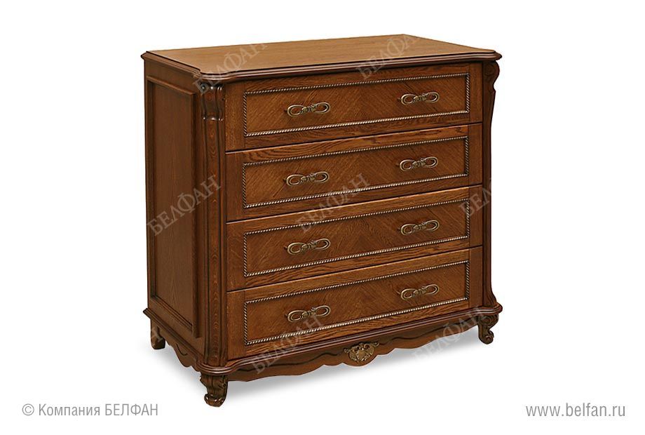 Комод из коллекции «Алези» (Alezi) отлично подойдет для квартир или загородных домов, меблированных в итальянском стиле. Он оснащен четырьмя вместительными выдвижными ящиками с качественными доводчиками, обеспечивающими бесшумное закрывание. Обилие декоративных элементов (инкрустации по технологии маркетри, оригинальная фурнитура, пилястры и фигурный цоколь) и благородные оттенки делают этот комод настоящим произведением искусства.