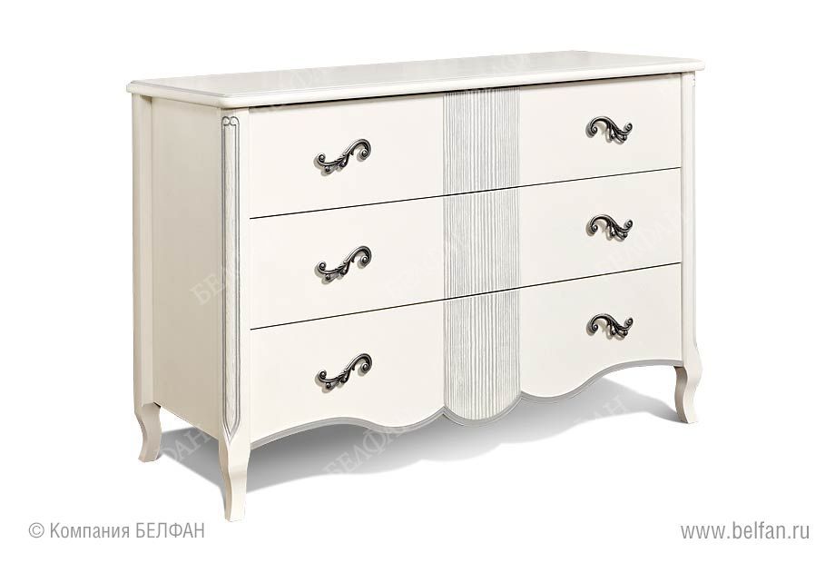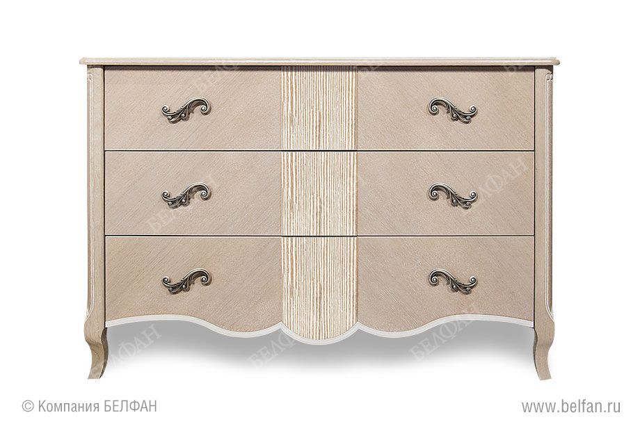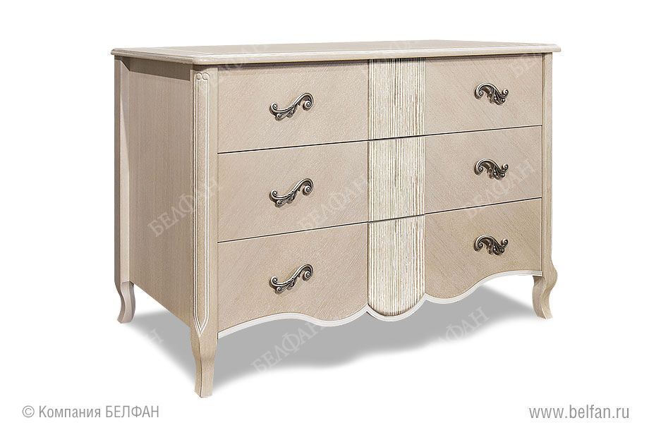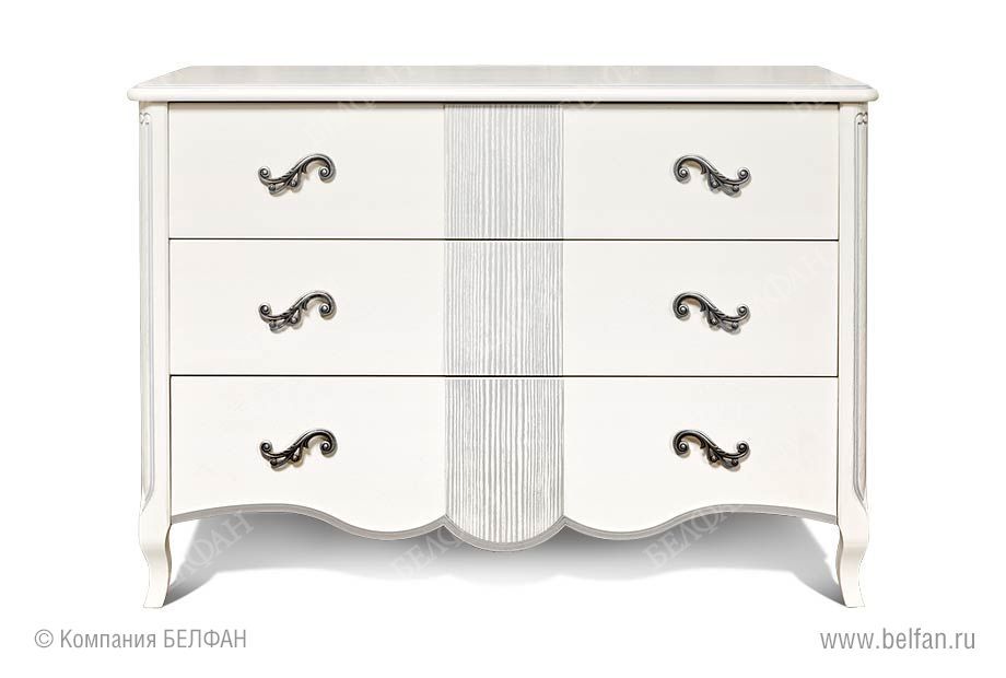 Комод из коллекции Katrin (Катрин) станет отличным дополнением к Вашей спальне – он обеспечит дополнительным местом для хранения, 3 глубоких и вместительных выдвижных ящика позволят хранить одежду или постельные принадлежности. Выполненный из массива и шпона дуба, этот комод выглядит эффектно и утонченно благодаря изящной фурнитуре, изогнутым ножкам и волне по нижнему краю. Белая патина, нанесенная вручную, завершает облик изысканного предмета мебели.