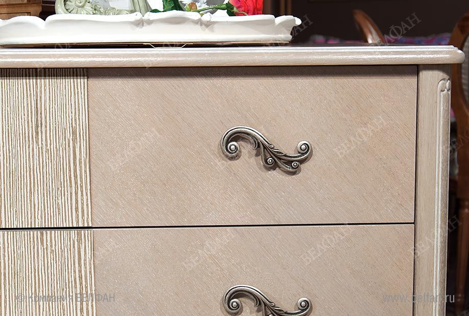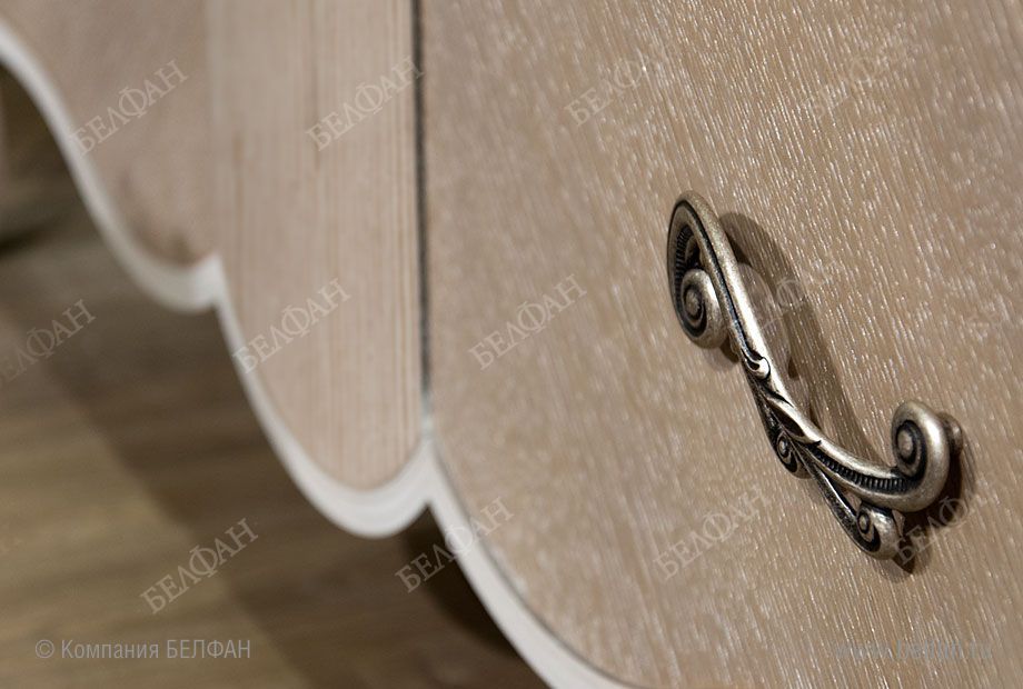 - Изюминку дизайну комода придает инкрустация натуральным шпоном дуба под углом 45 градусов и волнообразная форма нижней кромки.
