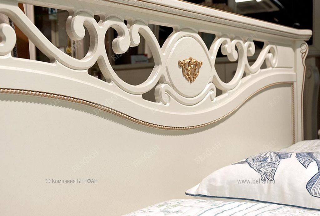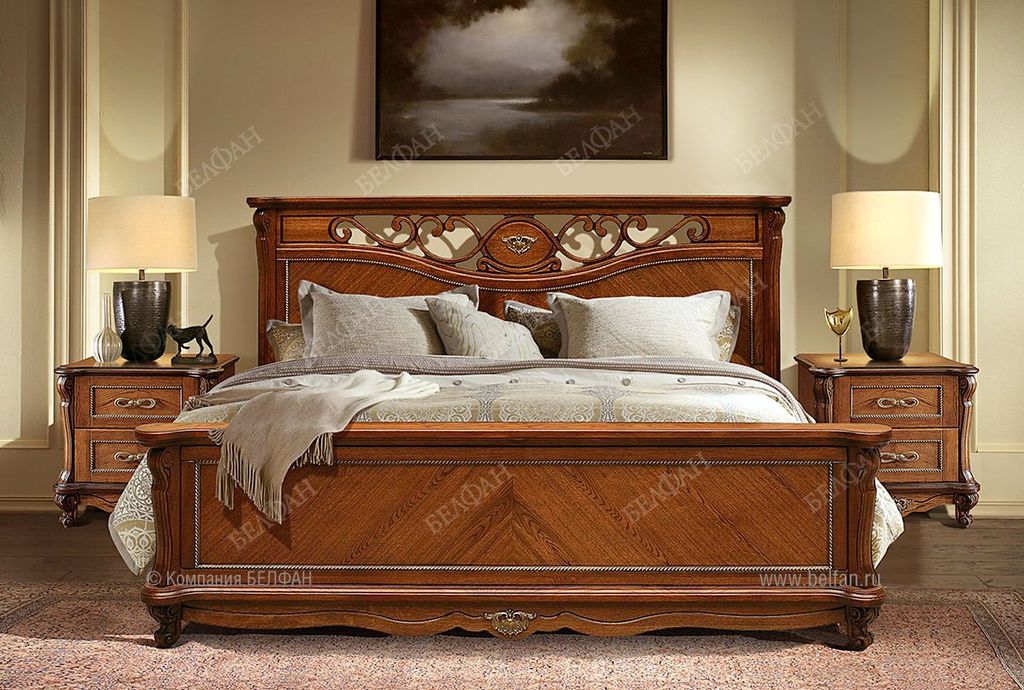 - Инкрустация по технологии маркетри на филенках фасадов в цвете «античная бронза» и декоративная ажурная резьба из массива дуба на изголовье;