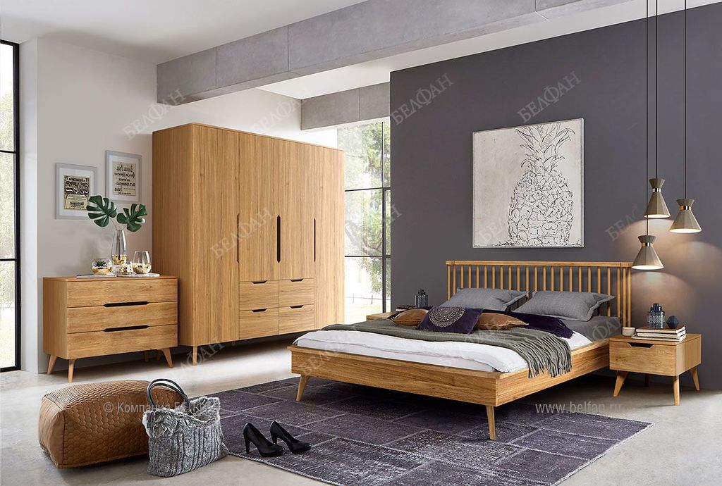 - Высота ножек из массива дуба позволяет легко проводить влажную уборку, а чистота и свежесть в спальне очень важны.