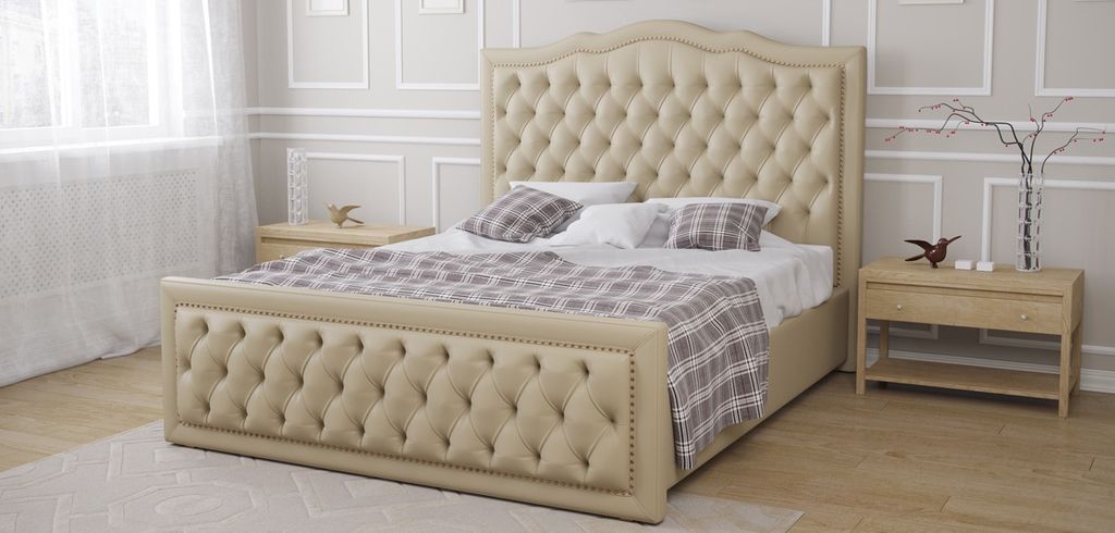 Кровать "Ренессанс" пользуется особой популярностью, ведь благодаря изголовью и изножью с каретной стяжкой и элегантной отделкой гвоздиками, она способна превратить обычную спальню в настоящее сонное королевство, где так и хочется прилечь и отдохнуть.