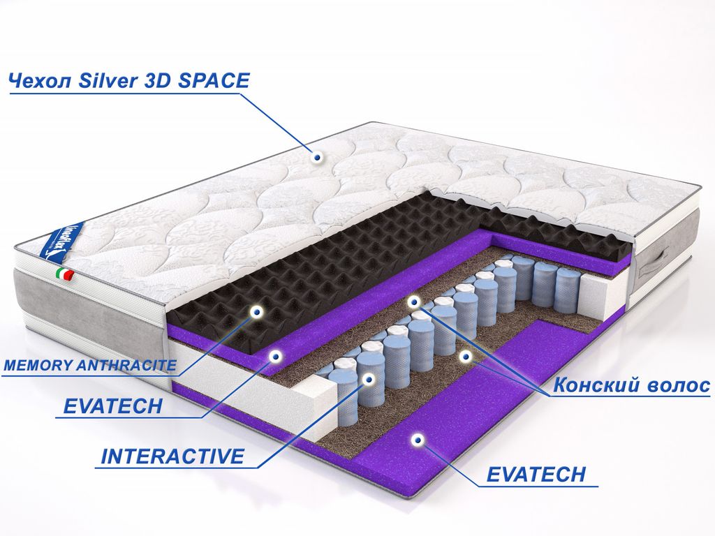 EVATECH c 7-ю зонами поддержки. Сложный рельеф вдоль и поперек матраца усиливает анатомические свойства матраца. EVATECH- полиуретановая пена на водной основе. Ее микроструктура напоминает множество мелких пружинок, которые соприкасаются с телом человека. Множество мелких каналов между молекулами отлично обеспечивают циркуляцию воздуха. Таким образом всегда поддерживается температурный баланс, что препятствует появлению вредных микроорганизмов. EVATECH- ультраэластичный материал и одновременно обладает высокой несущей способностью. Недаром его еще часто называют искусственным латексом.