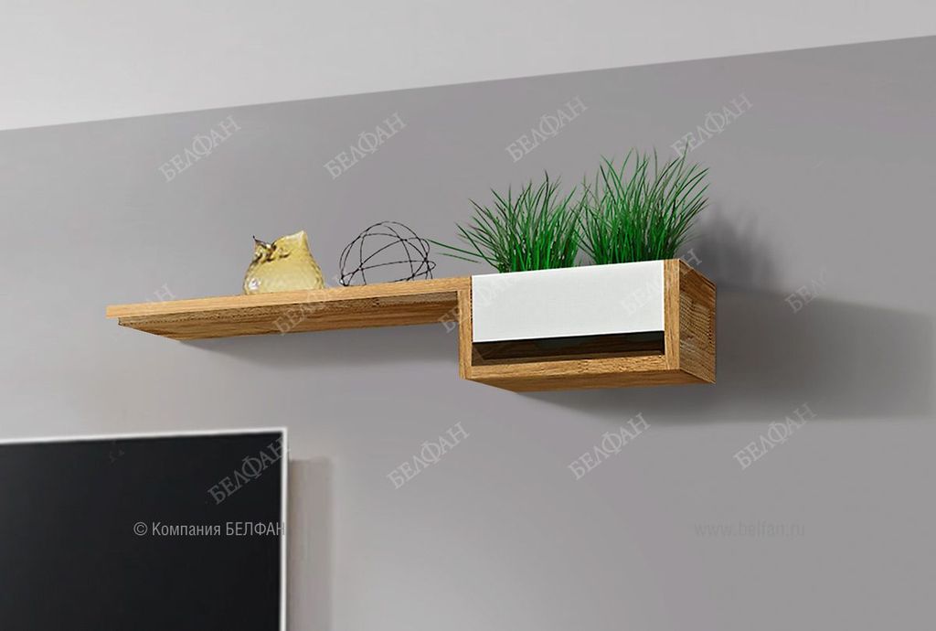 Навесная полка с нишей отлично дополнит интерьер в современном стиле. Ее можно разместить над комодом, кроватью, письменным столом или тумбой под ТВ.
