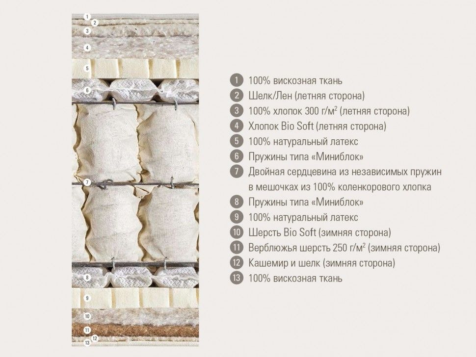 | Материалы в матрасе: | Латекс, Кокос, Овечья шерсть, Верблюжья шерсть, Кашемир, Шёлк, Хлопок, Лён |