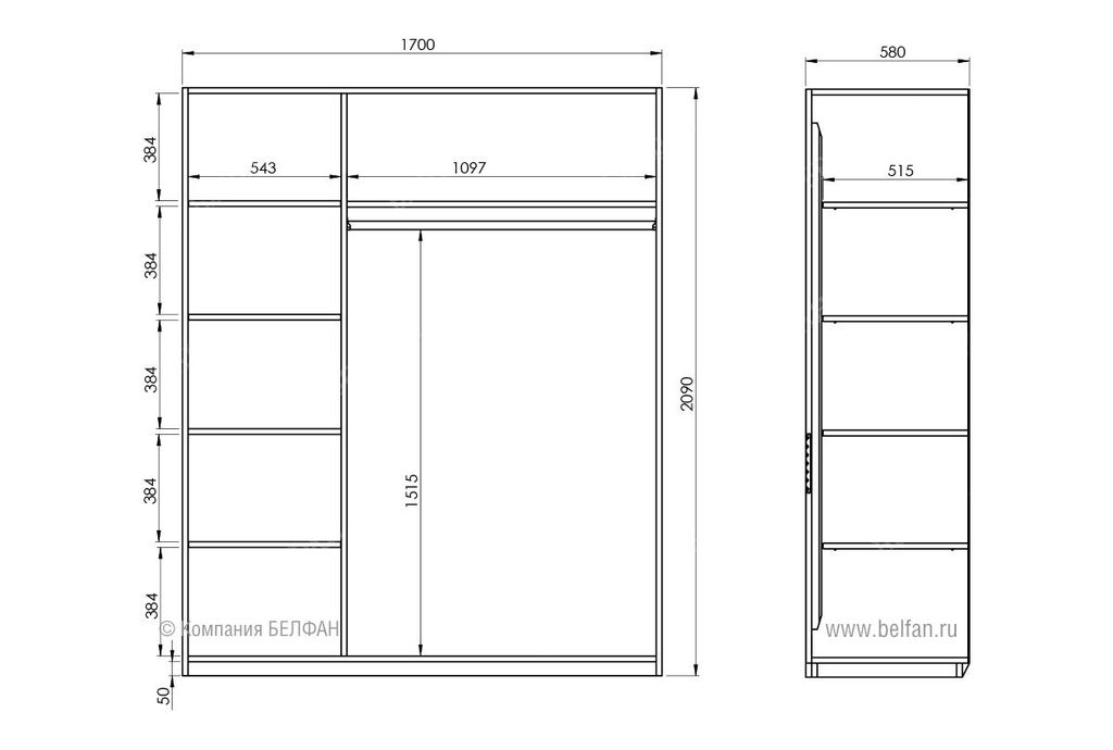 - Размер шкафа для одежды: ширина 1700 мм, высота 2090 мм, глубина 580 мм.