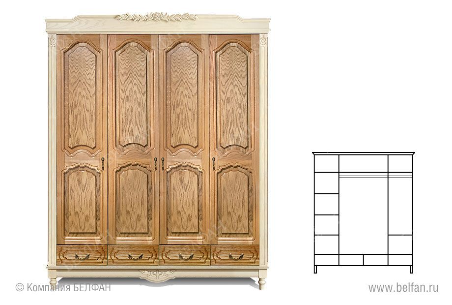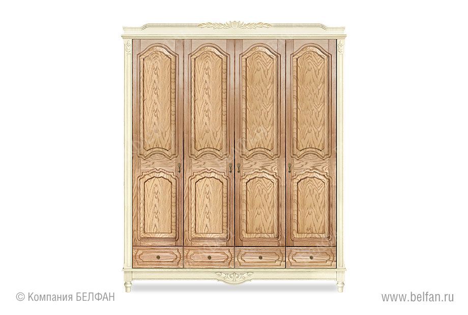 Четырехдверный шкаф для одежды «Франческа» (Francheska) подойдет для большой спальни либо загородного дома. Он очень вместителен, благодаря наличию множества полок, штанги для одежды и 4-х выдвижных ящиков.
