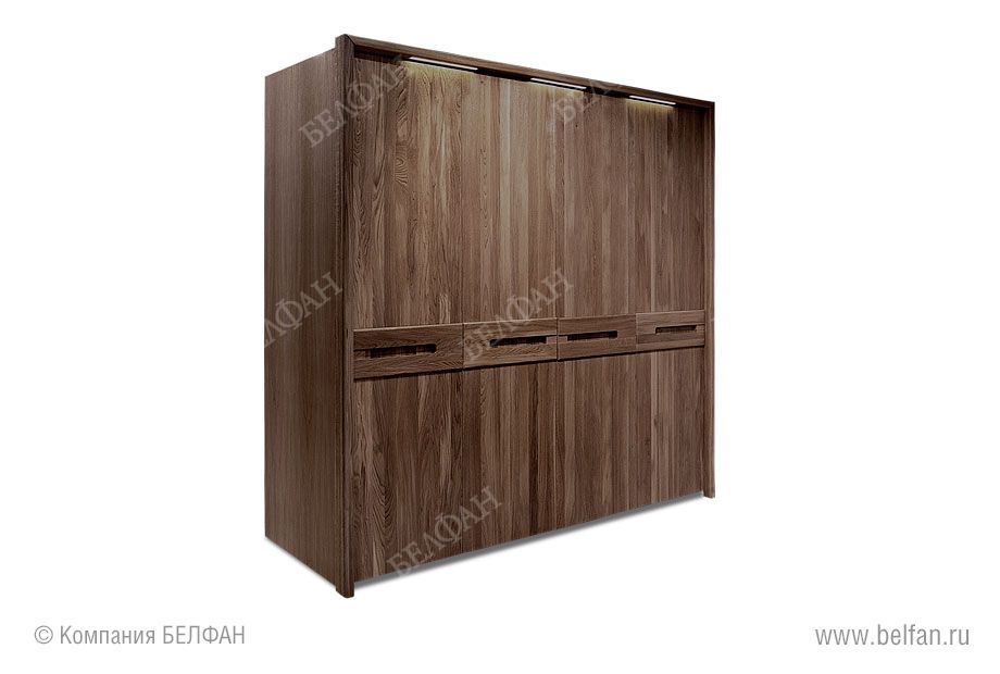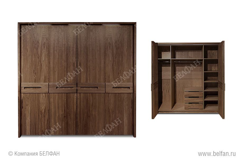 Четырёхдверный шкаф из коллекции «Хедмарк» подойдет для просторной квартиры или для загородного дома. Шкаф разбит на три секции. Центральная оснащена штангой для одежды и небольшой тумбой с выдвижными ящиками: в них Вы можете хранить как одежду, так и обувь. В левой секции также есть штанга, а в правой – полки. Ультрамодный дизайн позволит шкафу отлично вписаться в современный интерьер, а само изделие может стать прекрасным инструментом для зонирования комнаты.