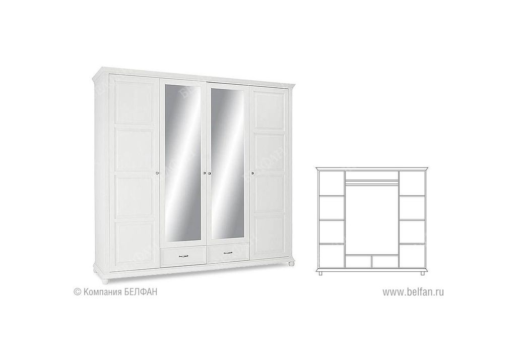 Очень просторный четырехдверный шкаф предлагает максимум для хранения вашей одежды. За четырьмя дверьми вы можете прекрасно хранить футболки, свитера или брюки на семи регулируемых полках. Блузки, платья и рубашки находят свое место на штанге для одежды.