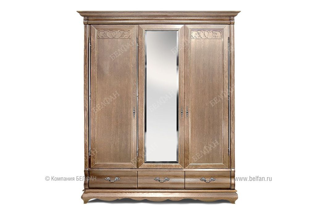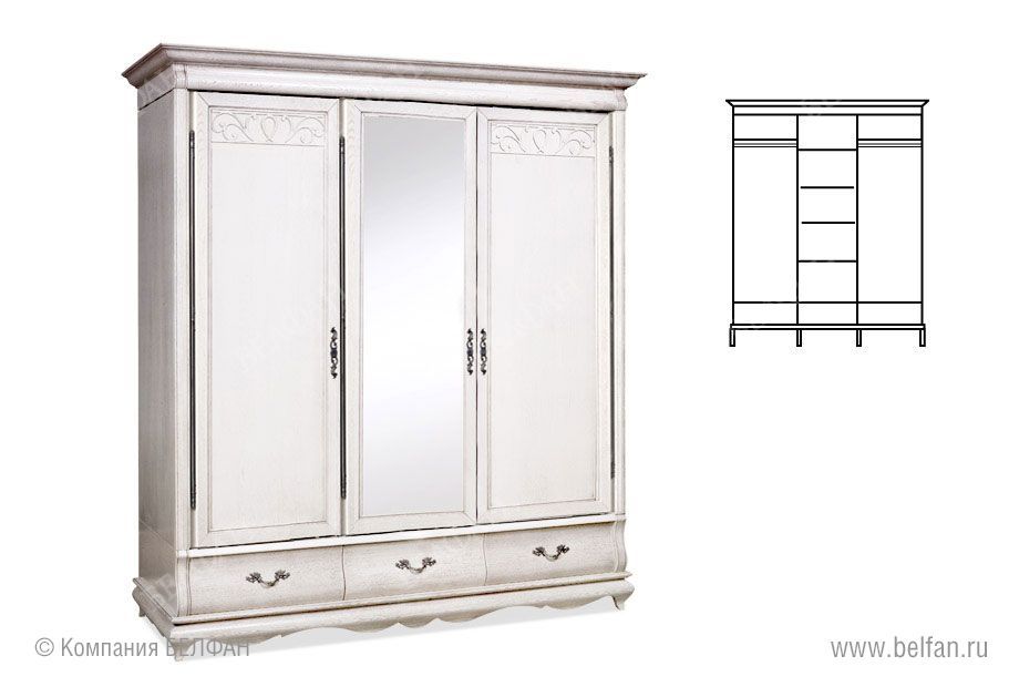 Элегантный трехдверный шкаф для одежды «Оскар» (Oskar) с зеркалом выполнен из массива дуба. Изящные изгибы, зеркало на центральной створке, со вкусом подобранная фурнитура придают его виду благородство. Зрительно не стесняя пространство, шкафы цвета «белая эмаль с темной патиной» создают в помещении легкую и умиротворенную обстановку. Также неординарно выглядит шкаф в цвете «орех».