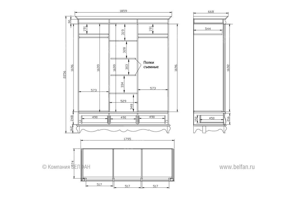 - Съемные полки в центральной части и штанги для одежды по бокам.