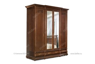 Элегантный четырехдверный шкаф для одежды «Оскар» (Oskar) с зеркалом выполнен из массива дуба. Четко выделенные линии дверей, зеркало на центральной створке, имитирующее ручную работу старинных мастеров и точеные металлические ручки придают его виду благородство. Зрительно расширяя пространство, белые шкафы создают в помещении легкую и умиротворенную обстановку, а также неординарно смотрится данный мебельный элемент в цвете «орех».