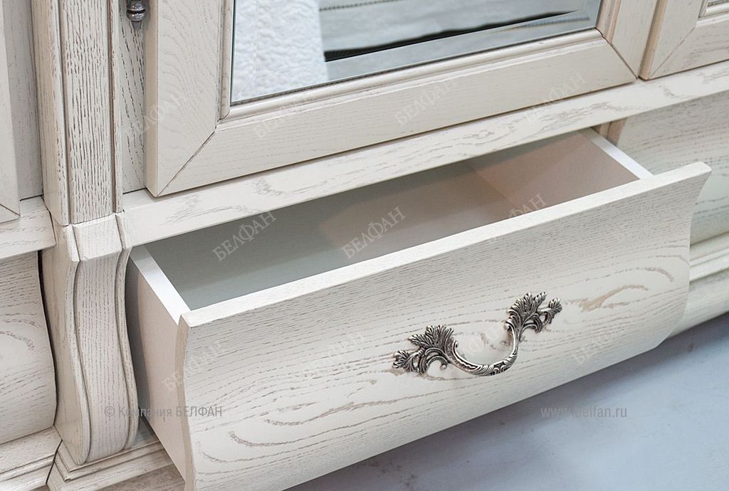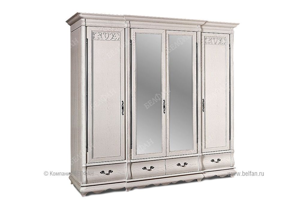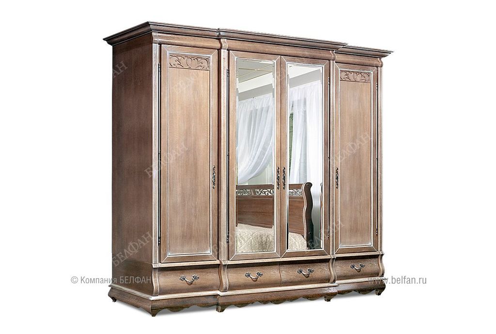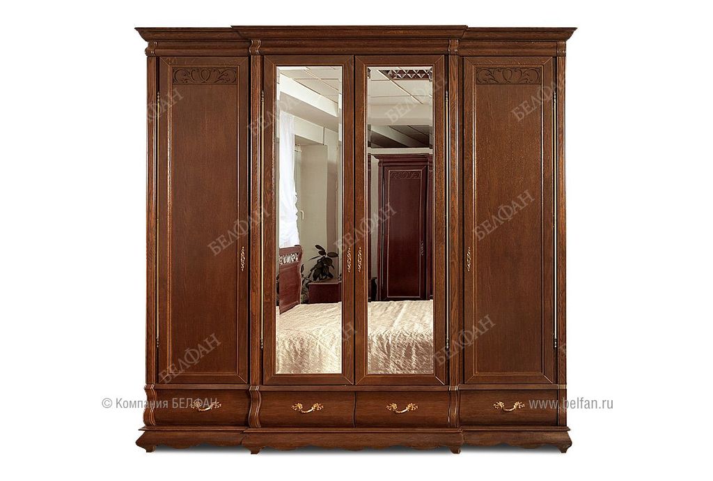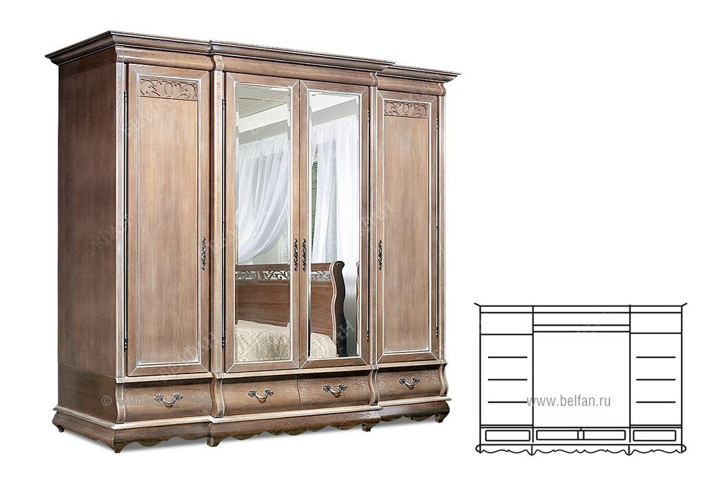 Элегантный четырехдверный шкаф для одежды «Оскар» (Oskar) с зеркалом выполнен из массива дуба. Четко выделенные линии дверей, зеркало на центральной створке, имитирующее ручную работу старинных мастеров и точеные металлические ручки придают его виду благородство. Зрительно расширяя пространство, белые шкафы создают в помещении легкую и умиротворенную обстановку, а также неординарно смотрится данный мебельный элемент в цвете «орех».